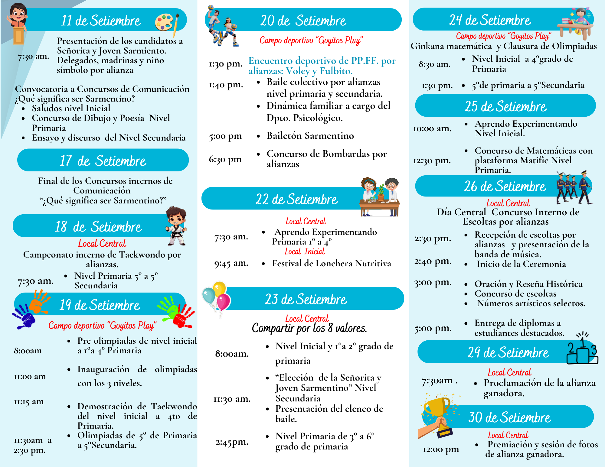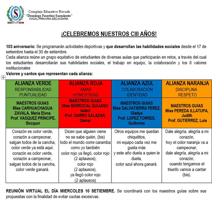 Le invitamos a ser parte de la conmemoración del CII aniversario, fecha de júbilo para nuestros estudiantes que viven el mes de setiembre en fraternal amistad a través de la práctica de los 8 valores institucionales y de las actividades programadas para desarrollar el talento sarmentino.