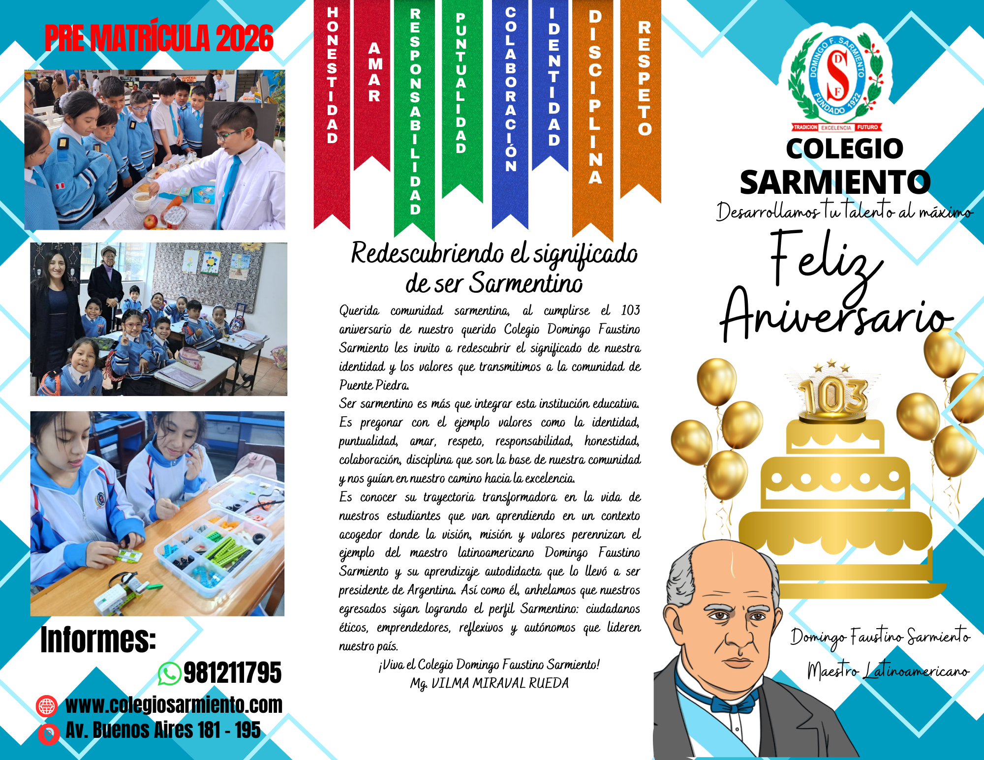 Conmemoramos 103 años de historia educativa, reafirmando nuestra identidad y compromiso con la excelencia. Ser sarmentino es vivir valores que nos distinguen: respeto, responsabilidad, honestidad, colaboración y disciplina. Inspirados en Domingo Faustino Sarmiento, formamos ciudadanos íntegros y líderes para el futuro del país.